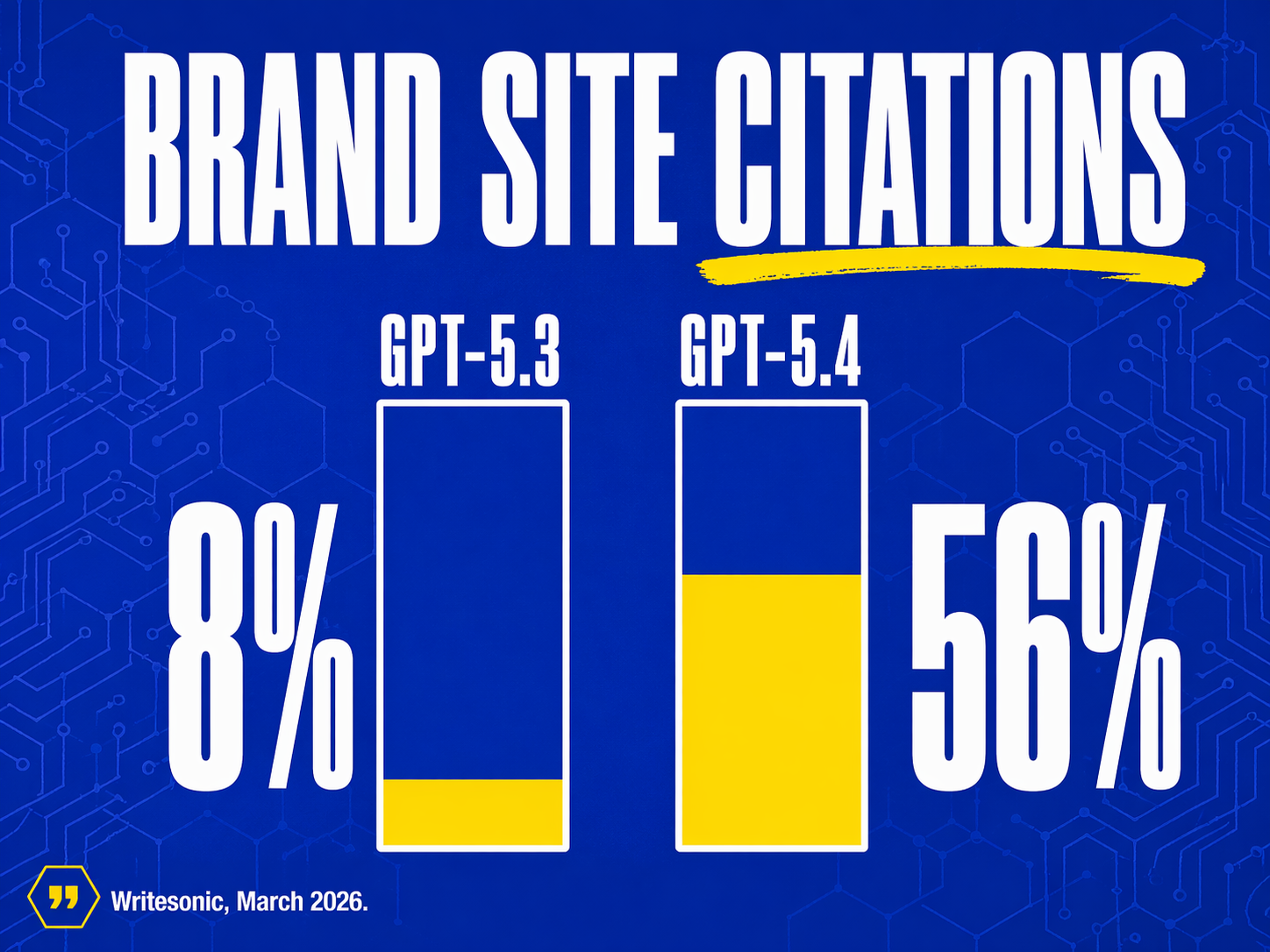 GPT-5.4 cites brand-owned websites 56% of the time.GPT-5.3 cites them 8% of the time. That's a 7x gap between two models running on the same search index, answering the same questions (Writesonic, March 2026). GPT-5.2, the model GPT-5.3 replaced, cited brand sites 22% of the time. So the free default got meaningfully worse for brand-owned content, and the thinking model went in the opposite direction.